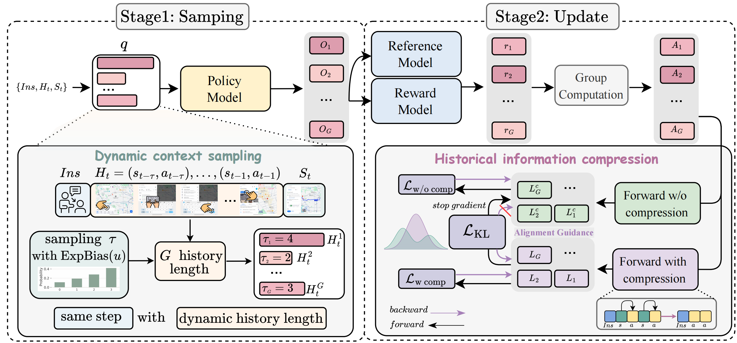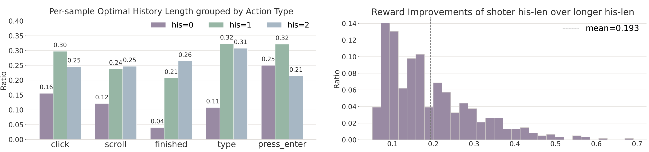 In this paper, we present HiconAgent, a history-aware GUI agent trained with History Context-aware Policy Optimization. Through extensive empirical investigations, we first revisited how history is utilized in GUI reinforcement learning agents. Our two key studies revealed that different decision steps prefer different history lengths and historical actions serve as information flow anchors. By pairing DCS and AHC, our model outperforms larger models with fewer FLOPs. These results highlight HiconAgent as a practical path toward lightweight, high-performance GUI agents.