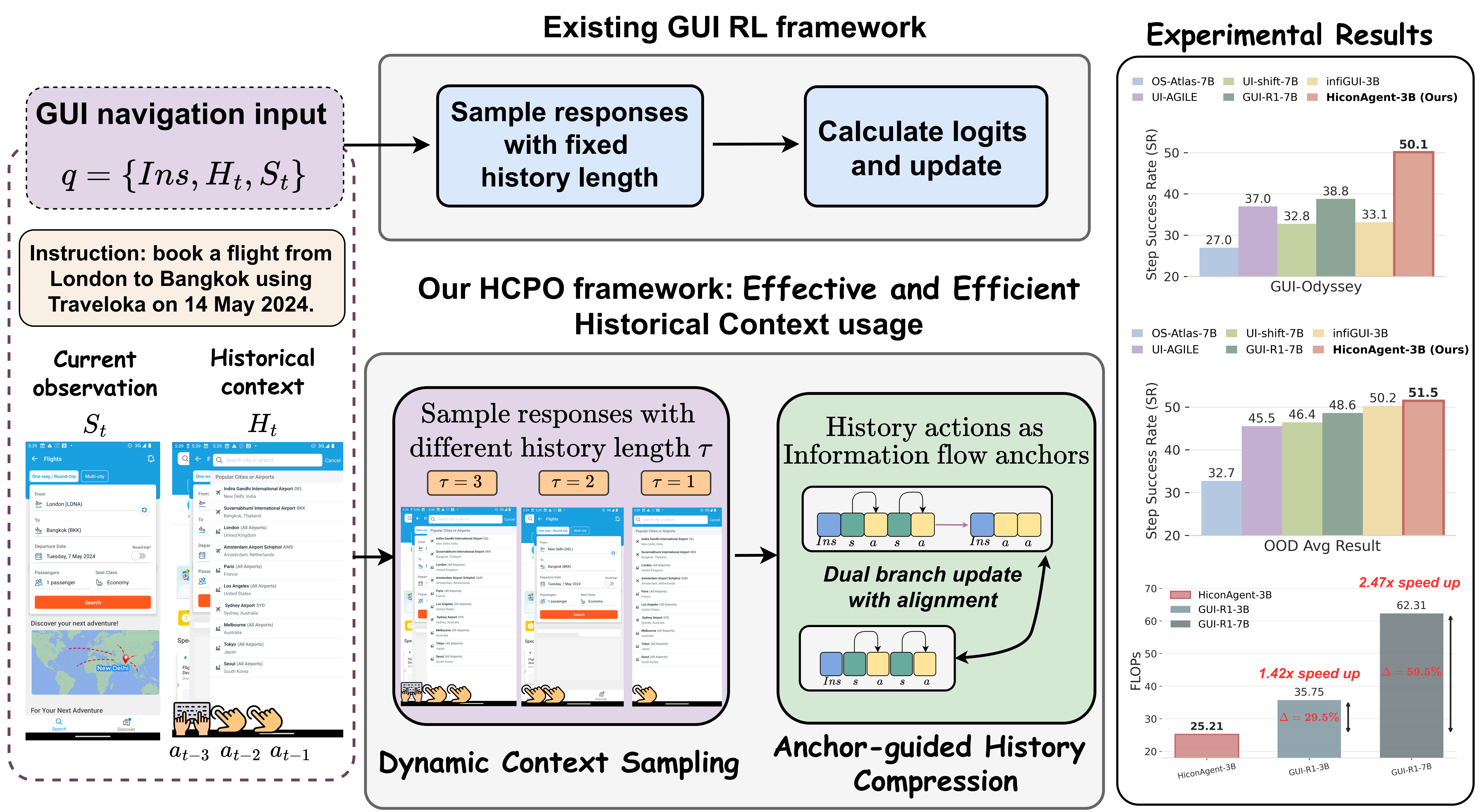 Graphical User Interface (GUI) agents require effective utilization of historical context to perform sequential navigation tasks. While incorporating past actions and observations can significantly improve decision-making, naively using full history leads to excessive computational overhead and potential distraction from irrelevant information. In this work, we introduce HiconAgent, a GUI agent trained with History Context-aware Policy Optimization (HCPO) for effective and efficient utilization of historical information. HCPO explicitly optimizes history usage in both sampling and policy updates by integrating two complementary components: (1) Dynamic Context Sampling (DCS) presents the agent with variable-length histories during sampling, enabling adaptive use of the most relevant historical context to improve sequential decision quality; (2) Anchor-guided History Compression (AHC) refines the policy update phase via a dual-branch optimization strategy, where the compressed branch drops history observations while keeping history actions as information flow anchors. The compressed and uncompressed branches are coupled through a history-enhanced alignment loss to enforce consistent history usage, achieving efficiency with minimal performance degradation. Extensive experiments on mainstream GUI navigation benchmarks demonstrate the strong performance of our model. Despite its smaller size, HiconAgent-3B outperforms GUI-R1-7B by +8.46% grounding and +11.32% step successful rate on GUI-Odyssey, while achieving comparable results on AndroidControl and AITW, with up to 2.47× computational speedup and 60% FLOPs reduction.